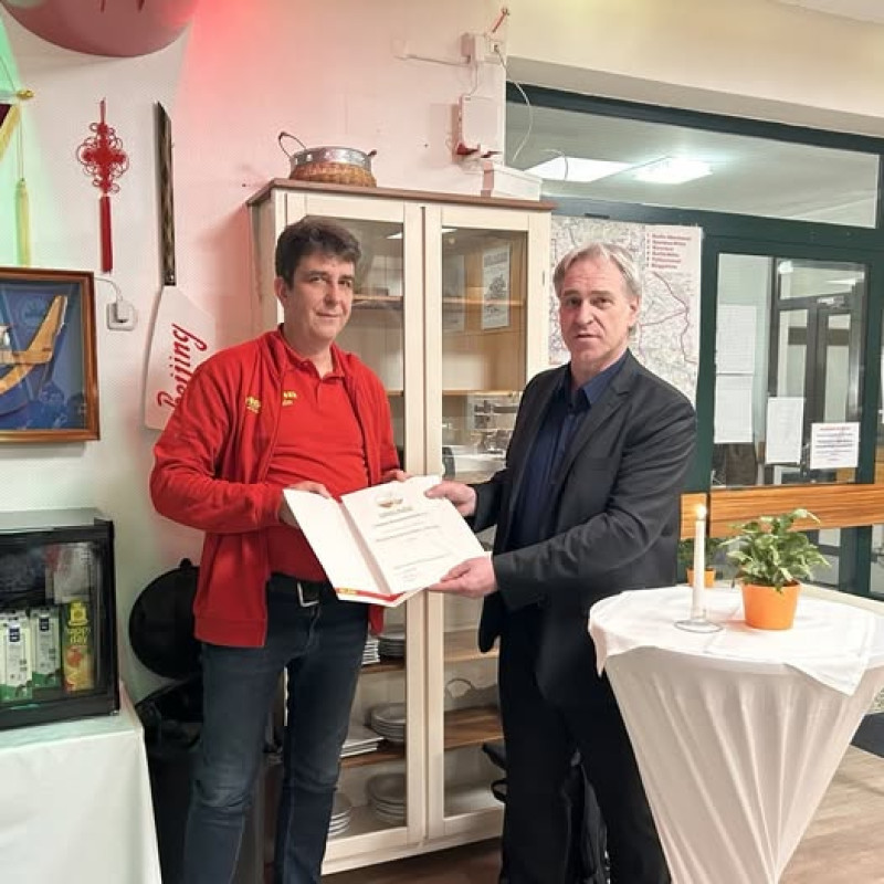 Auch wir hatten dieses Mal die Gelegenheit, Danke zu sagen: Seit inzwischen 10 Jahren ist der Landesruderverband Mitglied der DLRG-Spandau. Als Zeichen unserer Wertschätzung nahm LRV-Präsident Thomas Haun stellvertretend für seinen Verband unsere Urkunde sowie das Mitgliedsehrenzeichen entgegen.